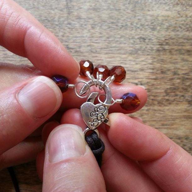 Form meets function in this handcrafted stitch marker necklace featuring five genuine Czech crystal markers in a gorgeous topaz shade, on a functional pewter clasp. Just open the clasp and slide off however many markers you need - never get caught without a stitch marker on hand again!