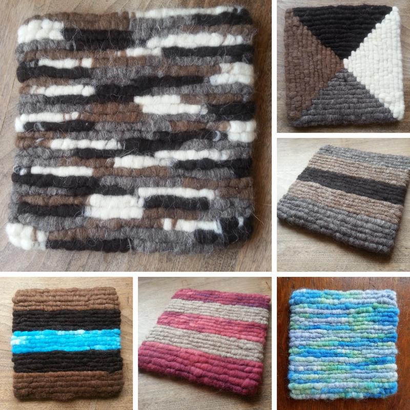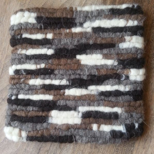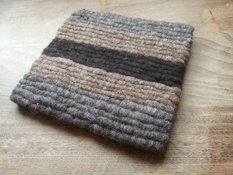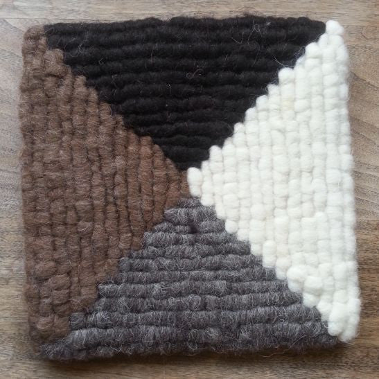 Four patterns are available: Tweed, Four Corners, Stripes (natural or natural+dyed), or Multi-Colored (Iris colorway). Variations may occur in roving color, as colored roving is hand-dyed and natural shades change each year with the sheep.