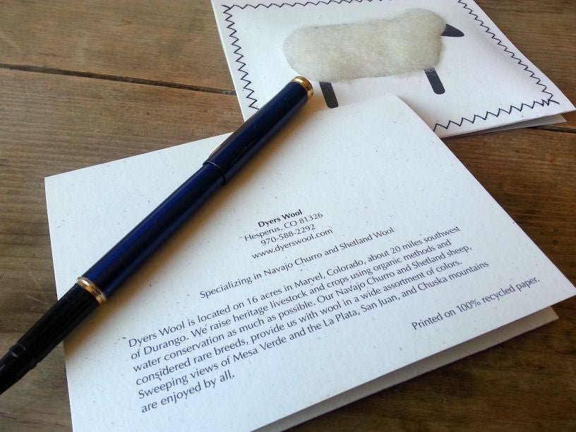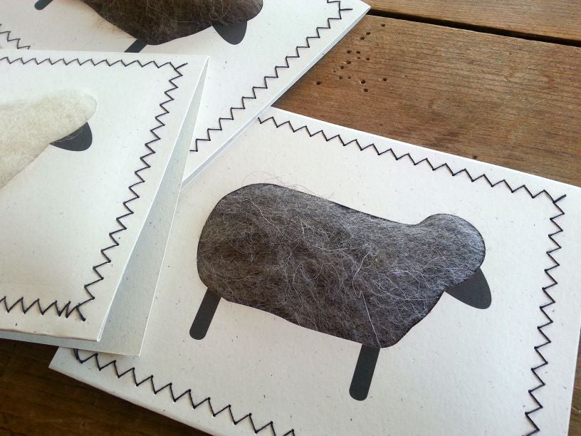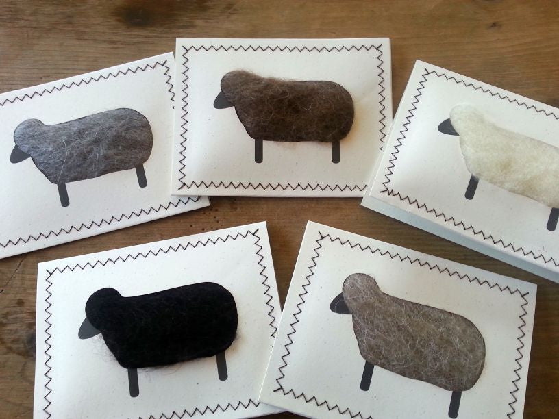 These handcrafted blank notecards are made with our homegrown Navajo Churro wool, with a stitched edging, and come with kraft-colored envelopes. The assorted notecard pack includes a combination of the following colors: white, black, gray, brown, and/or light brown (also available in white on a kraft-colored card). Each card measures 5.5 x 4.25 inches. As seen in the October 2014 Victoria Magazine!