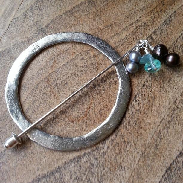 Round hammered USA-pewter shawl pin featuring apatite and pearl dangles. Pewter round measures approximately 1.5" and the stick pin measures approximately 2.5" with the clutch. Perfect for medium- to lightweight knit or woven garments.