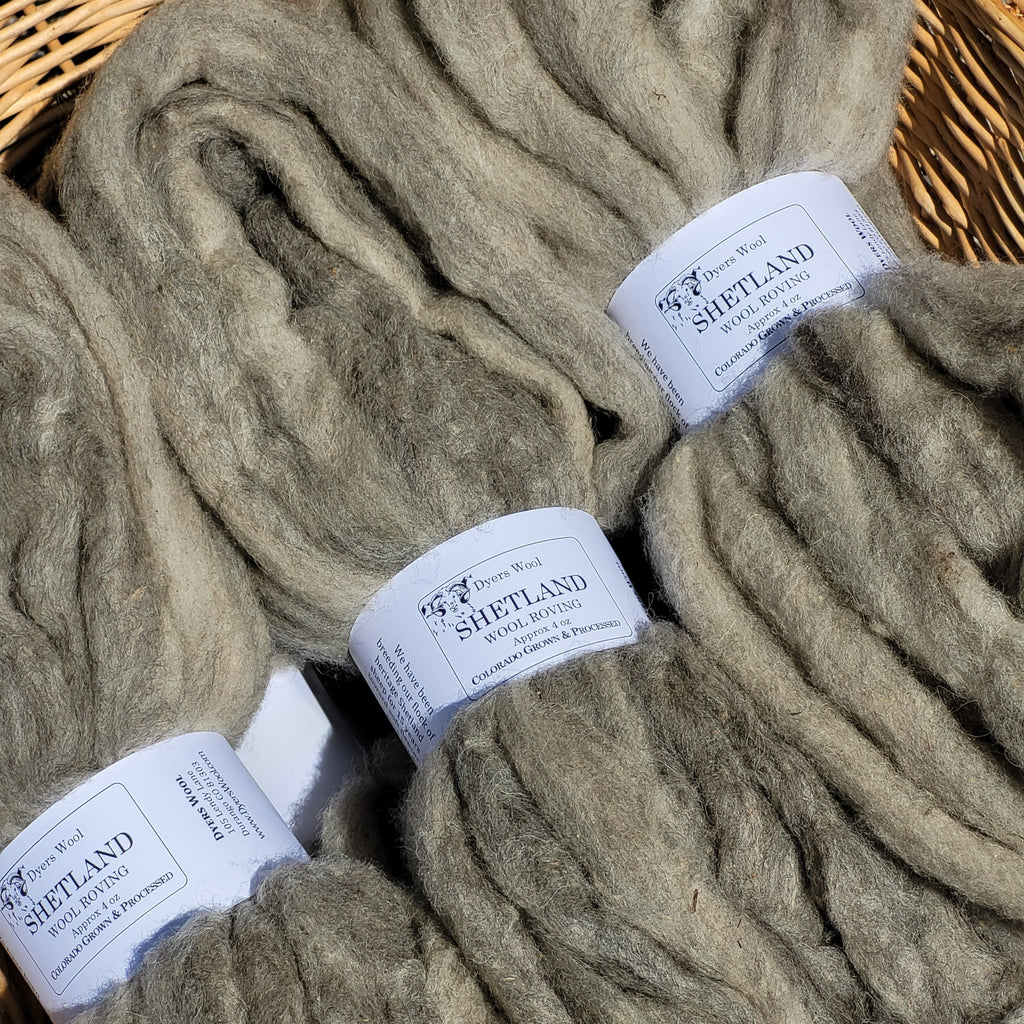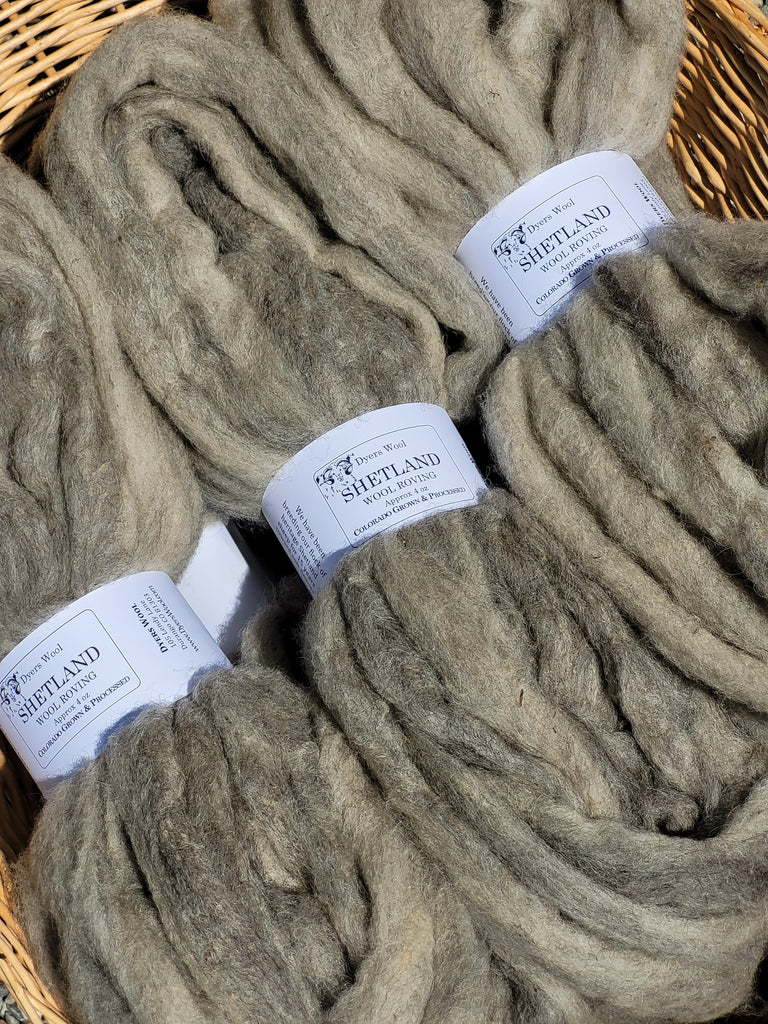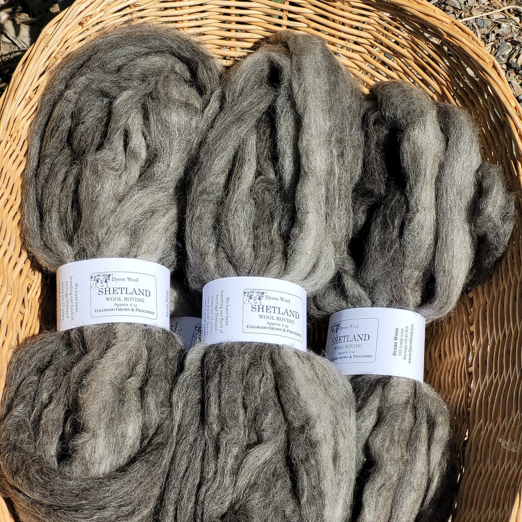 Colorado-grown Shetland roving in 4 oz hanks, from our flock of heritage Shetland sheep. While there is a huge range in Shetland fleeces, from coarse to fine, we have been breeding Shetlands for 15 years to produce softer fleeces with a good handle and staple length -perfect for spinning, Fair Isle knitting, and felting. Their natural rainbow of colors creates a palette of choices for your next fiber project.