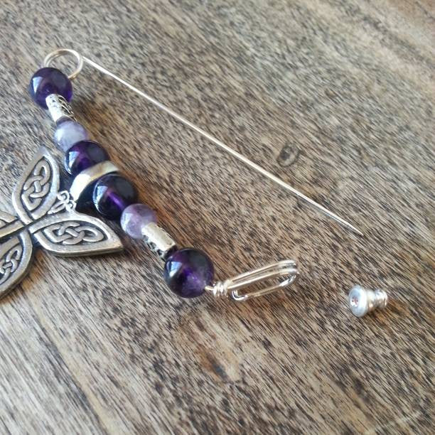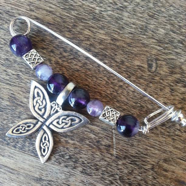 Handmade gemstone shawl pin features a USA-made pewter butterfly pendant and amethyst beads. Ideal for hand-knitted or -woven scarves and shawls, or even just pinned to your favorite sweater. Our custom fastener keeps the pin more secure, and a pin clutch covers the pointed end of the pin for safety.