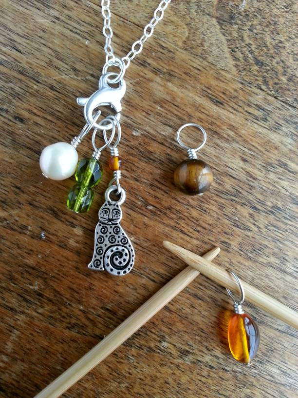 Form meets function in this handcrafted stitch marker necklace featuring four gemstone markers (amber, pearl, genuine Czech crystal, and tiger eye) and one USA-made pewter cat charm marker with amber bead. Markers fit up to size 8 needles and are held by a sterling silver clasp for true ease of use. Available on an 18" sterling silver chain, 30" sterling silver chain, or 30" adjustable black cotton cord. Never get caught without a stitch marker on hand again!