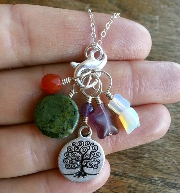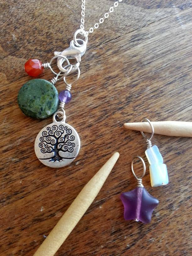 Form meets function in this handcrafted stitch marker necklace featuring four gemstone markers (carnelian, royalite, glass star, and moonstone) and one USA-made pewter tree charm marker with amethyst bead. Markers fit up to size 8 needles and are held by a sterling silver clasp for true ease of use. Available on an 18" sterling silver chain, 30" sterling silver chain, or 30" adjustable black cotton cord. Never get caught without a stitch marker on hand again!