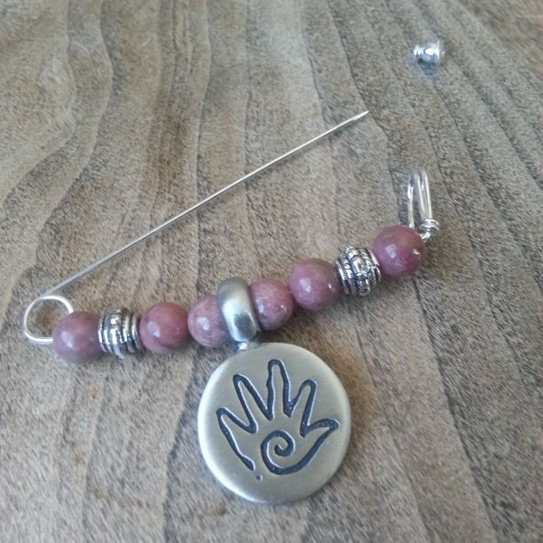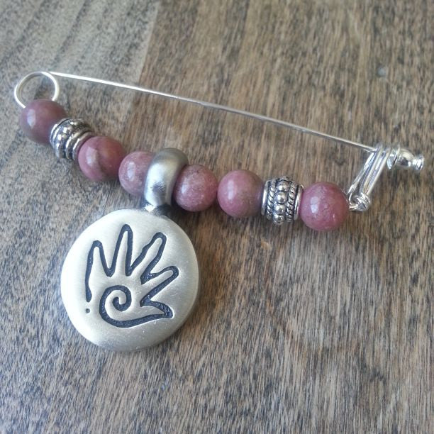 Handcrafted gemstone shawl pin features a pewter hand pendant, symbolizing creativity and/or healing, and rhodonite beads. Celebrate a light shade of Pantone's 2015 Color of the Year, Marsala, with this pin - a color that engenders warmth and inspires creativity. The pin is ideal for hand-knitted or -woven scarves and shawls, or even just pinned to your favorite sweater. Our custom fastener keeps the pin more secure, and a pin clutch covers the pointed end of the pin for safety.