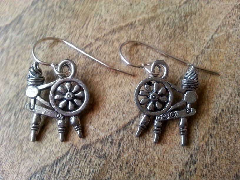 Cute USA-pewter spinning wheels on sterling silver earwires. The perfect gift for any spinner or fiber-fanatic! Each earring measures approximately 1" from top of earwire to bottom of charm.