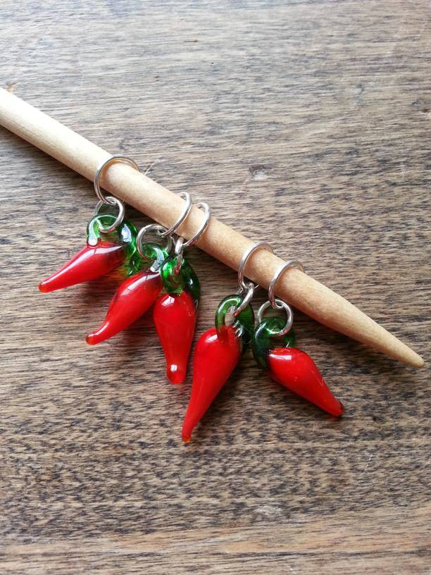 Add a Southwestern flair to your knitting with these glass chili pepper stitch markers. Markers fit up to U.S. size 8 needles. A perfect gift for that knitter or crocheter in your life!