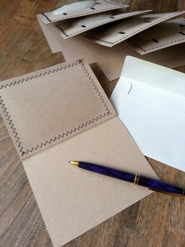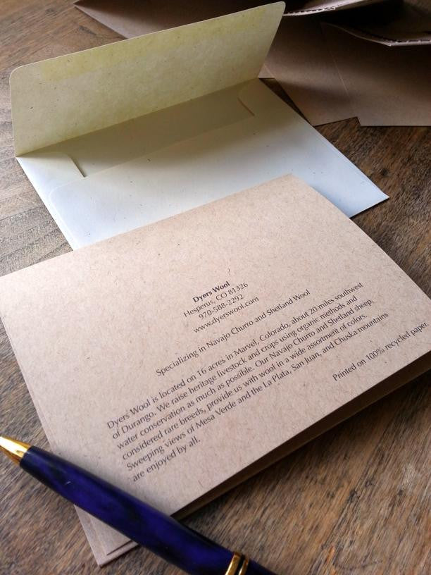 These handcrafted blank notecards are made with our homegrown Navajo Churro wool, with a stitched edging, and come with envelopes. The cards are a kraft-colored card stock with ivory envelopes. Each card measures 5.5 x 4.25 inches.